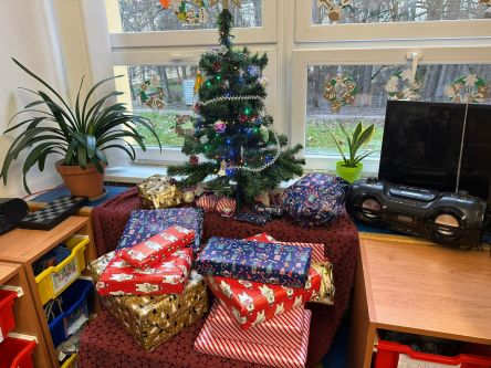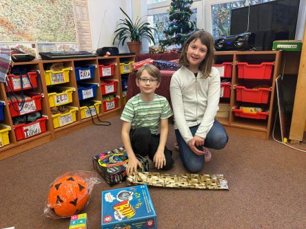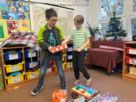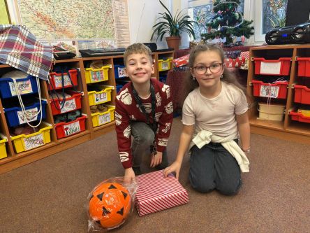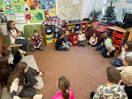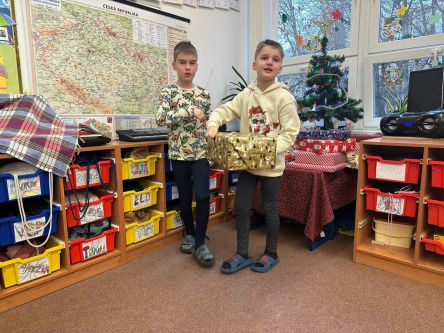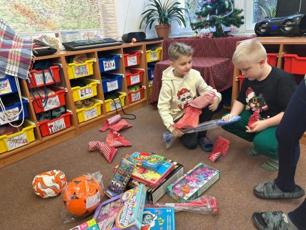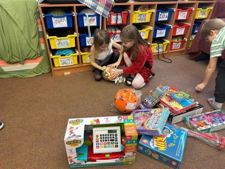 Děti z fialové družiny děkují Ježíškovi za krásné hry, autíčka, míče, barevná skákadla.