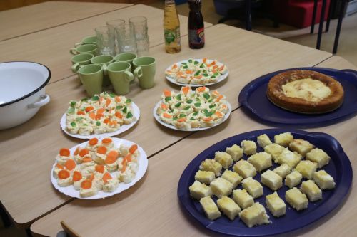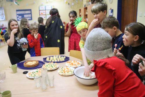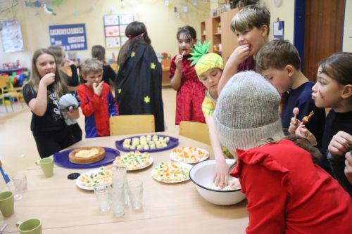 O den dříve jsme pekli tvarohový koláč. Než se koláč upekl, zahráli jsme tombolu. Byla to velká legrace. V naší tombole vyhrával každý los. Ve čtvrtek se tančilo, soutěžilo. Koláč nám moc chutnal.