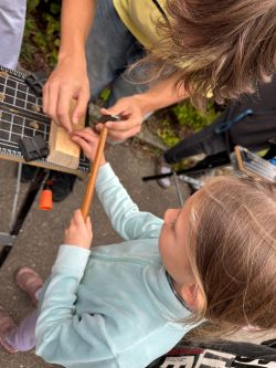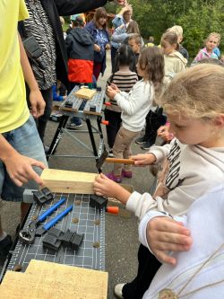 Děti si vyzkoušely jak správně držet kladívko při zatloukání hřebíku. Že není jednoduché zase hřebík vytáhnout. Vyrobily si přívěsek ze dřeva. A kdo chce kutit dál, může se přihlásit do kroužku Kutil :-).