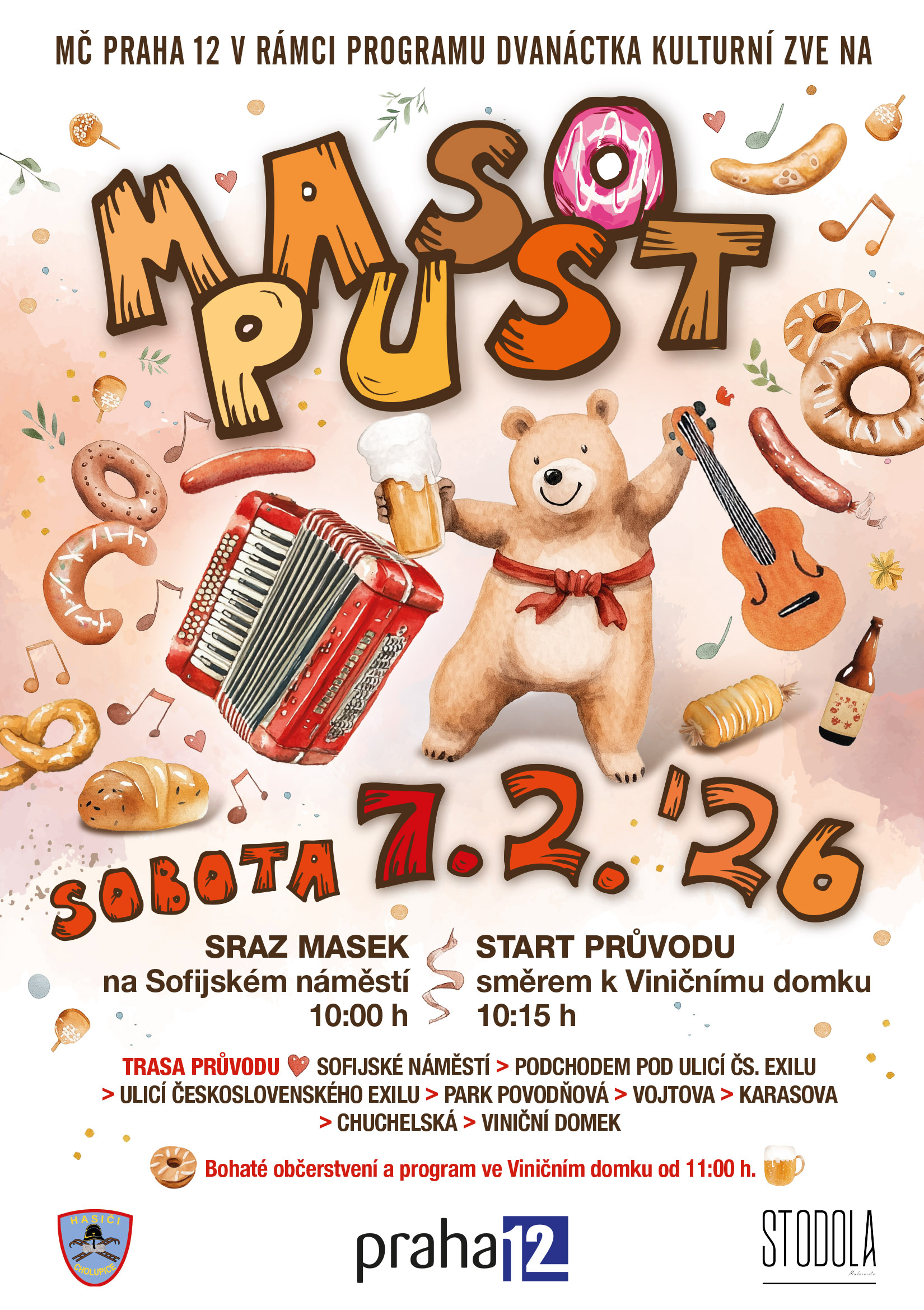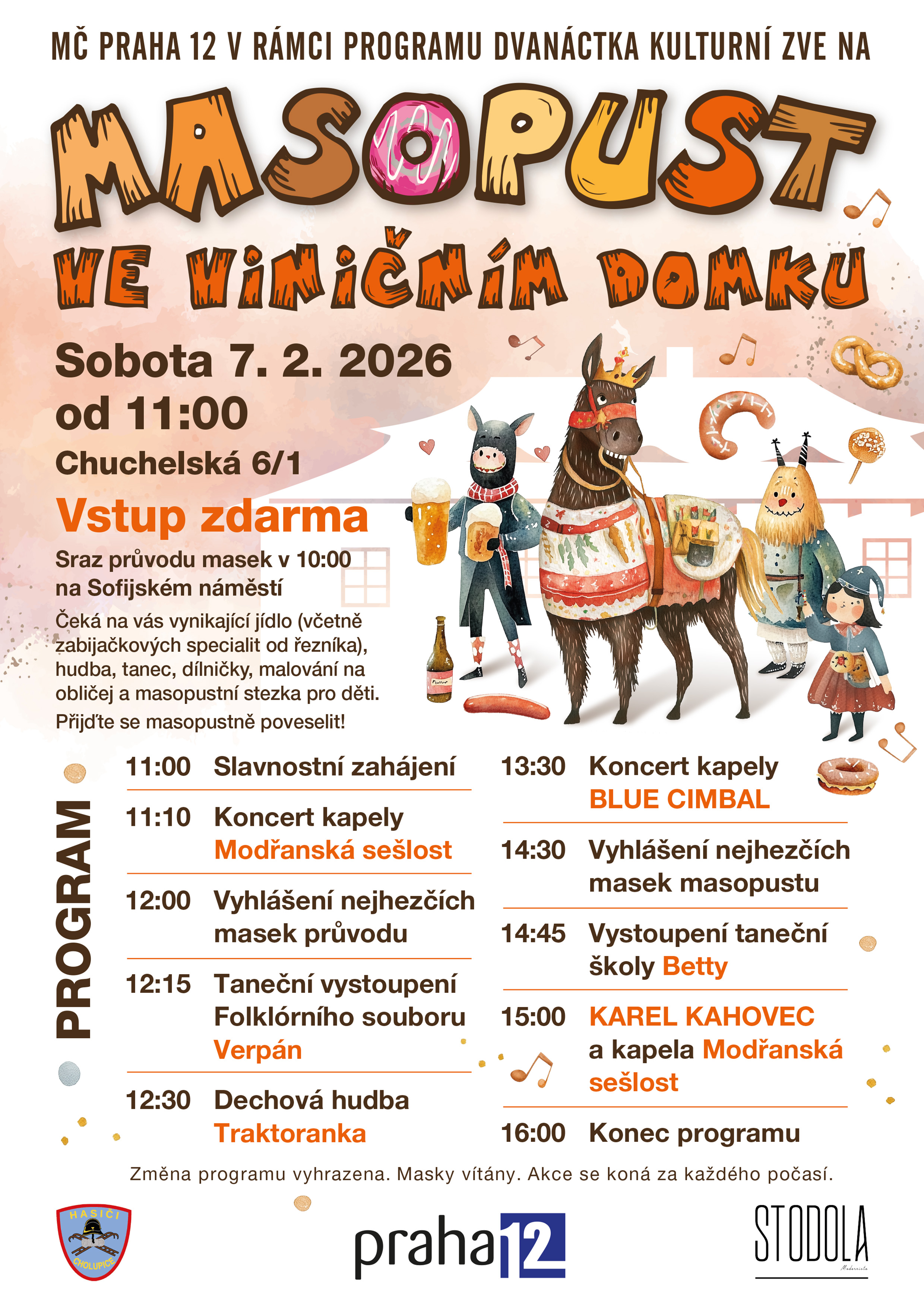 Městská část Praha 12 Vás srdečně zve na Masopust, který se koná v sobotu 7. února 2026.