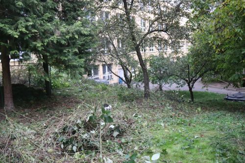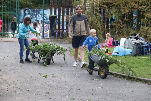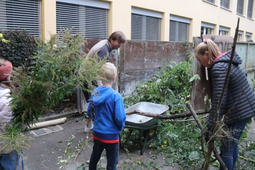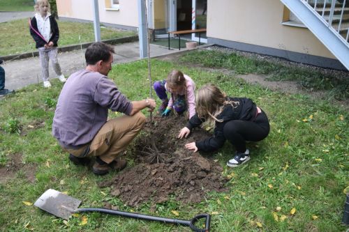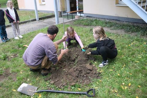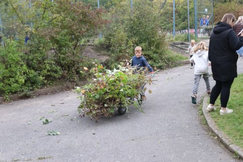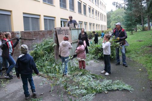 U hřiště odstranili náletové dřeviny, uklidili větve z přední části zahrady. Shrabali a odvezli posekaný ostružiník, který se rozrůstal v zadní části zahrady. Při tomto úklidu nám pomáhal i zahradník Michal Plundra. Odborně prořezal okrasné rostliny a ovocné stromy. S dětmi zasadil v zahradě novou dřevinu hloh a květiny – chrpy, kopretiny a chrastavec rolní.