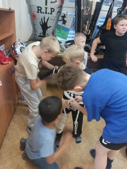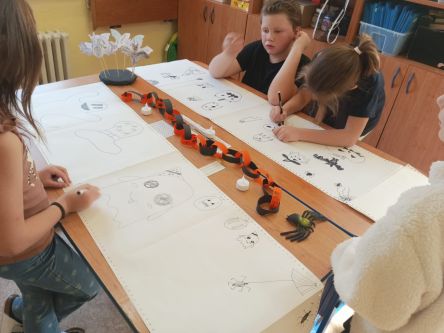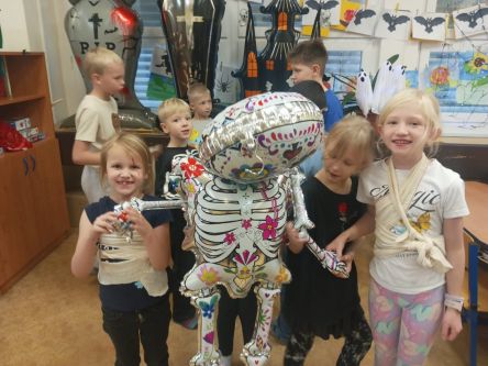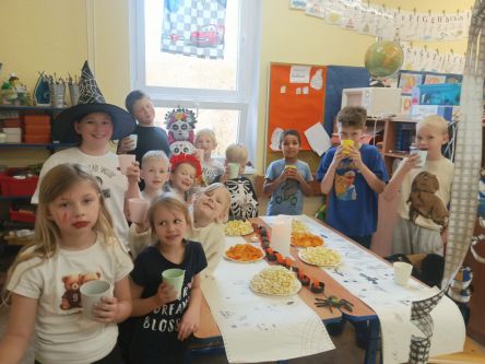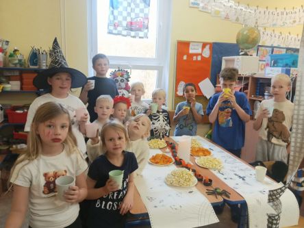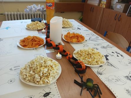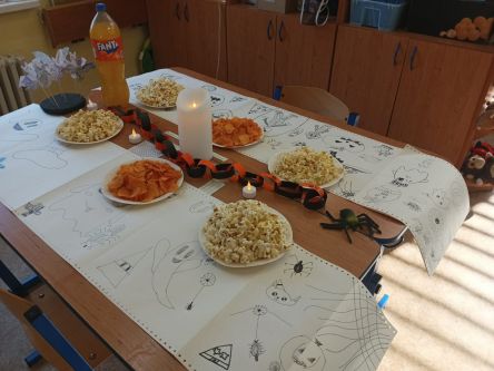 Občerstvení všem chutnalo. Strašidelný ubrus byl ze strašidelné dílny.