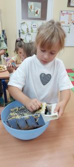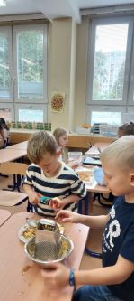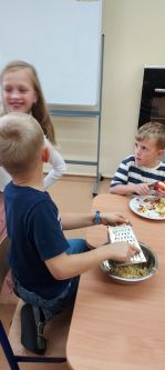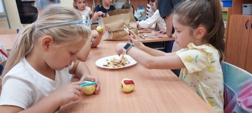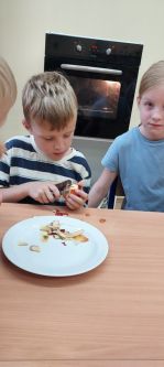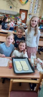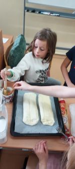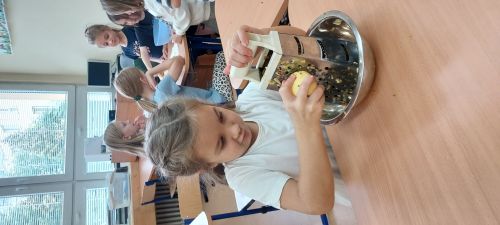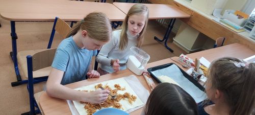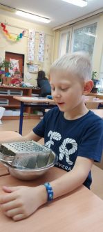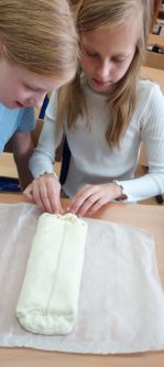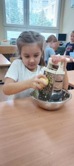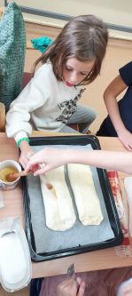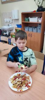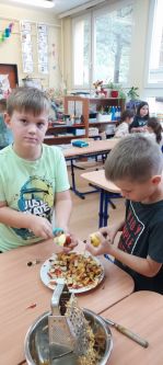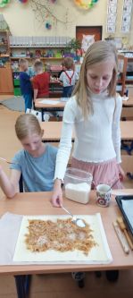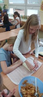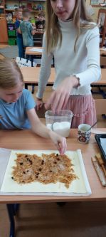 Díky paní Kaščákové a její jablíčkové nadílce jsme se mohli s nadšením vrhnout na výrobu jablečných štrůdlů. Celkem jich bylo šest a ještě zbyla nastrouhaná jablíčka se skořicí a rozinkami. Moc jsme si pochutnali, nic nezbylo