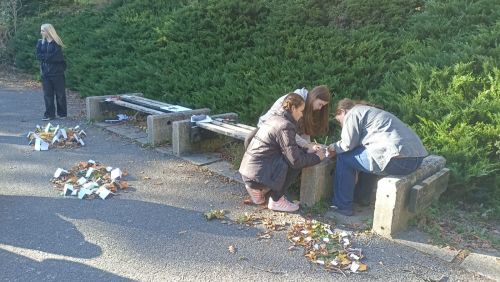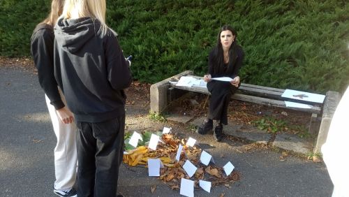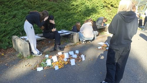 Na školním hřišti skládali barevnou mapu České republiky z podzimního listí a přírodních materiálů. Zelené listy představovaly nížiny, žluté a oranžové pahorkatiny a hnědé hory.