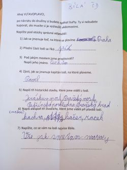 Plavbu jsme si užili, z parníků a lodiček nám mávali. Správně odpovědět na otázky pro Vltavoplavce bylo lehké. Posíláme vám je na fotografii.
