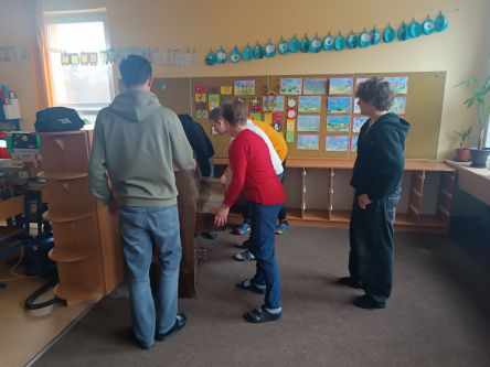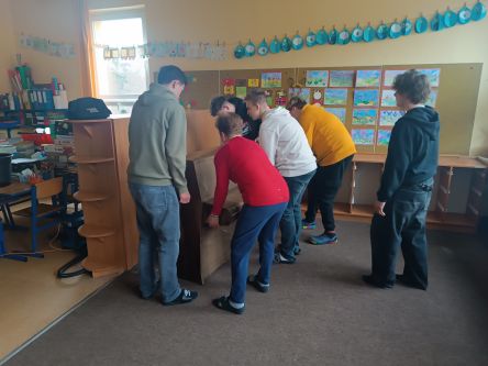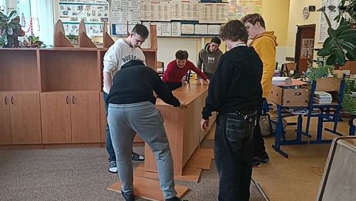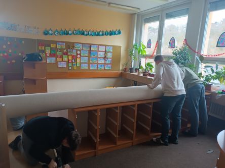 Byla to velmi náročná práce spojená se stěhováním nábytku, s montáží lišt a skříněk, s pokořením rozmarů koberce, který se velmi obtížně vměstnával do krajů třídy na stávající koberec. Velký dík za věnovaný čas v odpoledních hodinách zaslouží Přemek, Matyáš, Jenda, Kuba a Ondra.