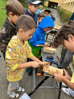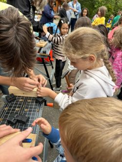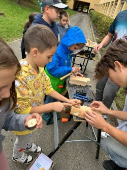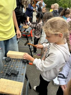 Děti si vyzkoušely jak správně držet kladívko při zatloukání hřebíku. Že není jednoduché zase hřebík vytáhnout. Vyrobily si přívěsek ze dřeva. A kdo chce kutit dál, může se přihlásit do kroužku Kutil :-).