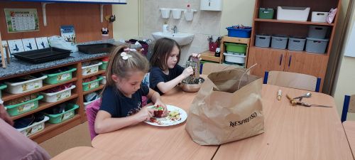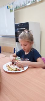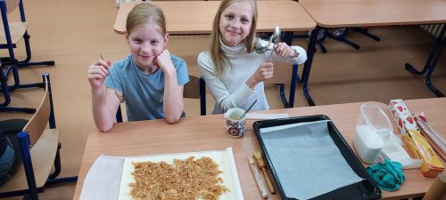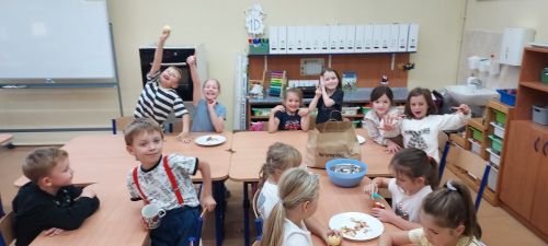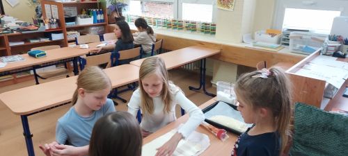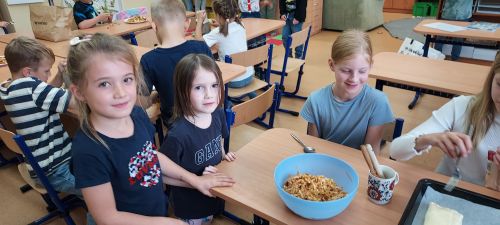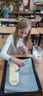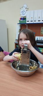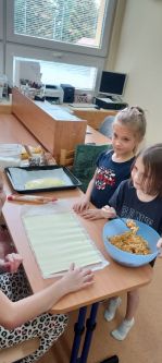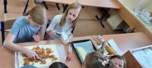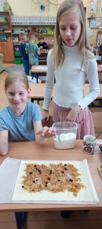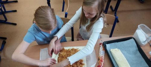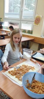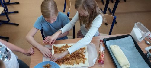 Díky paní Kaščákové a její jablíčkové nadílce jsme se mohli s nadšením vrhnout na výrobu jablečných štrůdlů. Celkem jich bylo šest a ještě zbyla nastrouhaná jablíčka se skořicí a rozinkami. Moc jsme si pochutnali, nic nezbylo