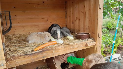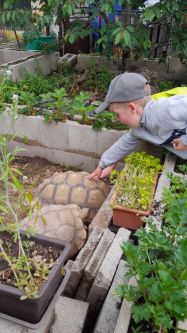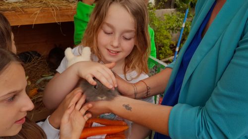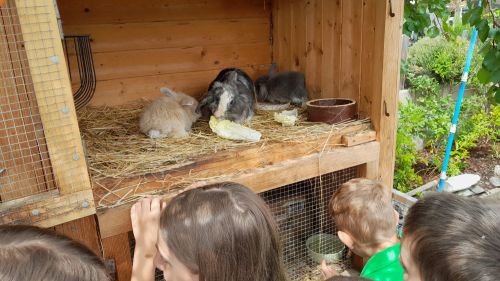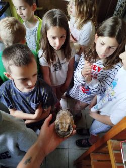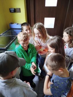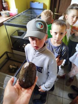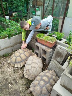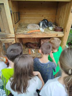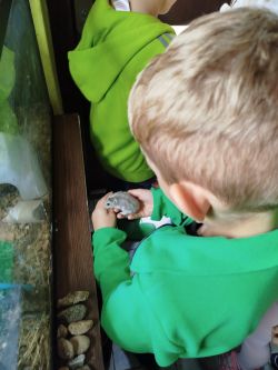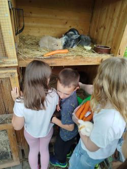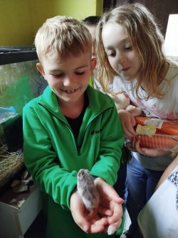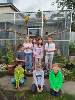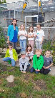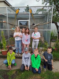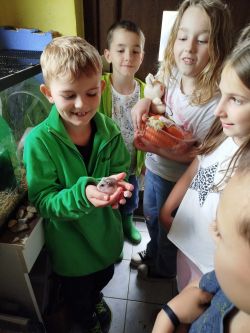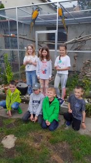 Po roce se Modráci pozdravili s Kevinem (to je želva), papoušky, opičkami, křepelkami, …….. a naší Lentilkou z družiny - to je to šedivé morčátko.